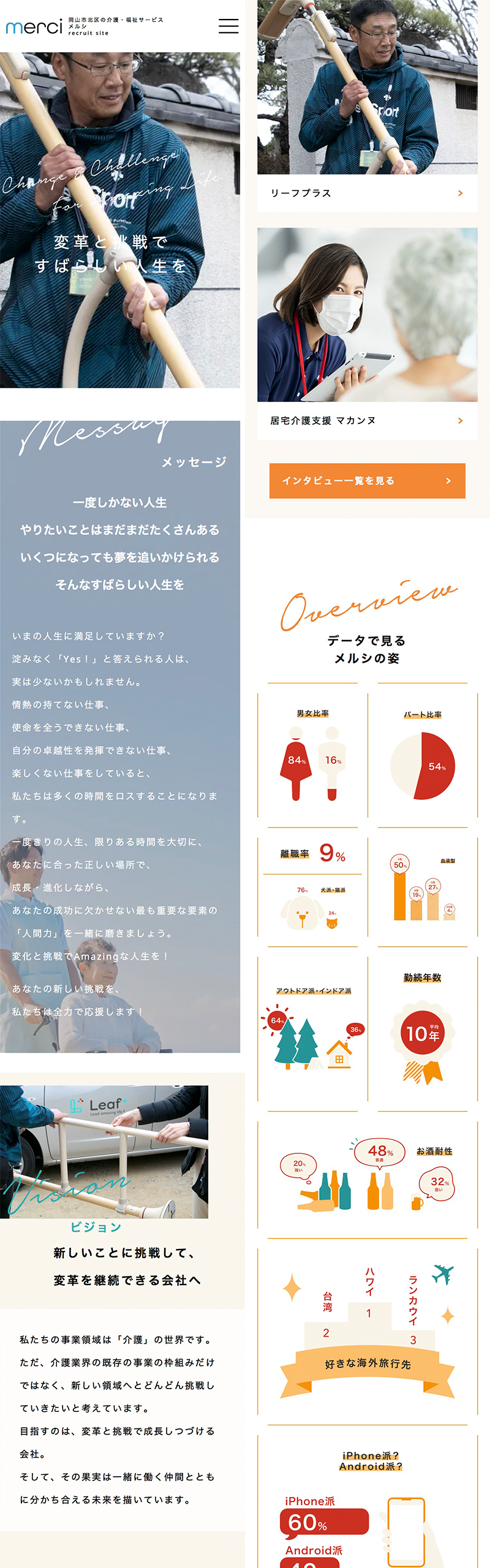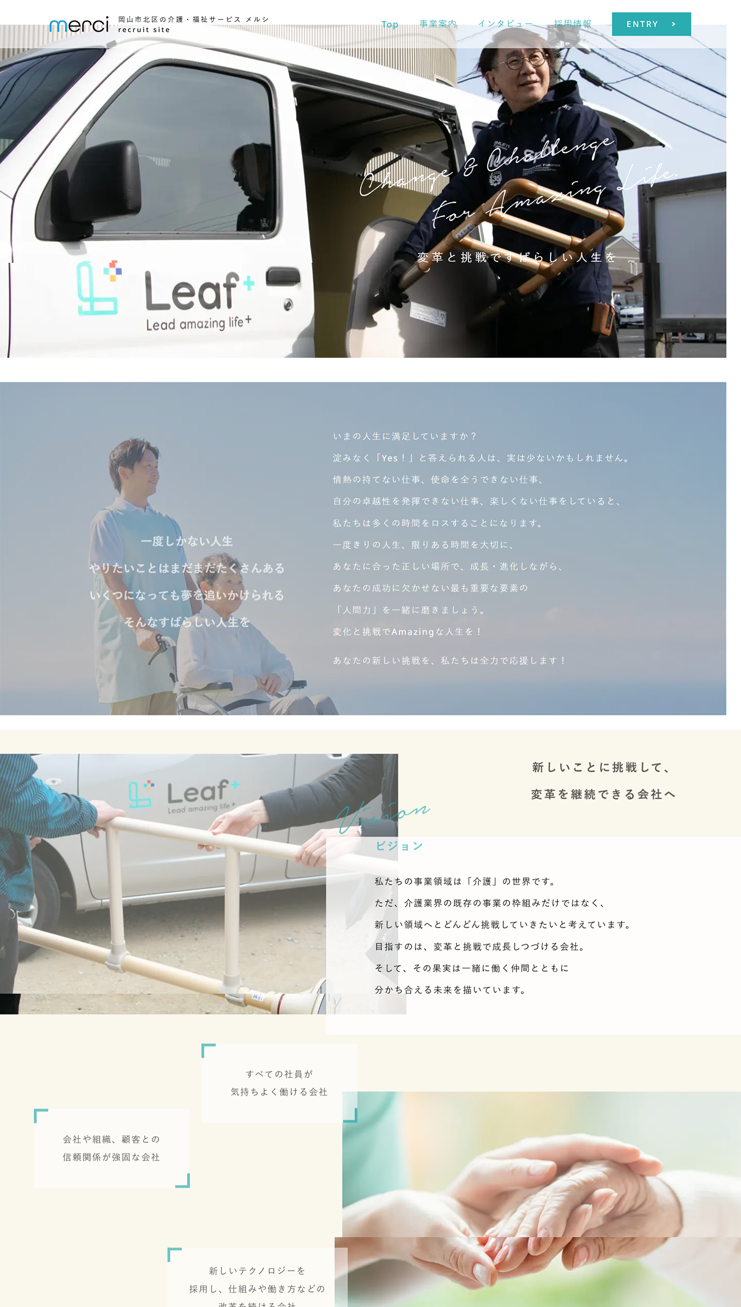 「変革と挑戦」のメッセージで、人生を豊かにする働き方を提案する採用サイト 岡山県でデイサービスやヘルパーステーションなど多様な介護サービスを展開するメルシグループ様。 採用活動においては、業界のイメージを刷新し、キャリアと人生の両面で成長できる職場であることを伝えたいとお考えでした。そこで、「変革と挑戦ですばらしい人生を」というメッセージを軸に、一人ひとりが自分の人生を大切にしながら働ける環境を打ち出したリクルートサイトを制作。情熱を持てる仕事、使命を全うできる仕事を通じて人間力を磨けることを、温かく前向きなビジュアルとトーンで表現しました。各事業所で活躍する社員インタビューや、時短勤務・在宅ワーク・資格取得支援など多様な働き方を丁寧に紹介することで、「ここなら自分も成長できる」と共感してくれる求職者からのエントリーが増えています。 URL https://merciservice.jp/ カテゴリー リクルート 業種 BtoC 介護・福祉 プラットフォーム wordpress 所在地 岡山県 Tweet Share Hatena Pocket RSS feedly Pin it 株式会社フローラ リクルートサイト前の記事 株式会社フローラ 居宅介護支援事業所 エンリッチ次の記事