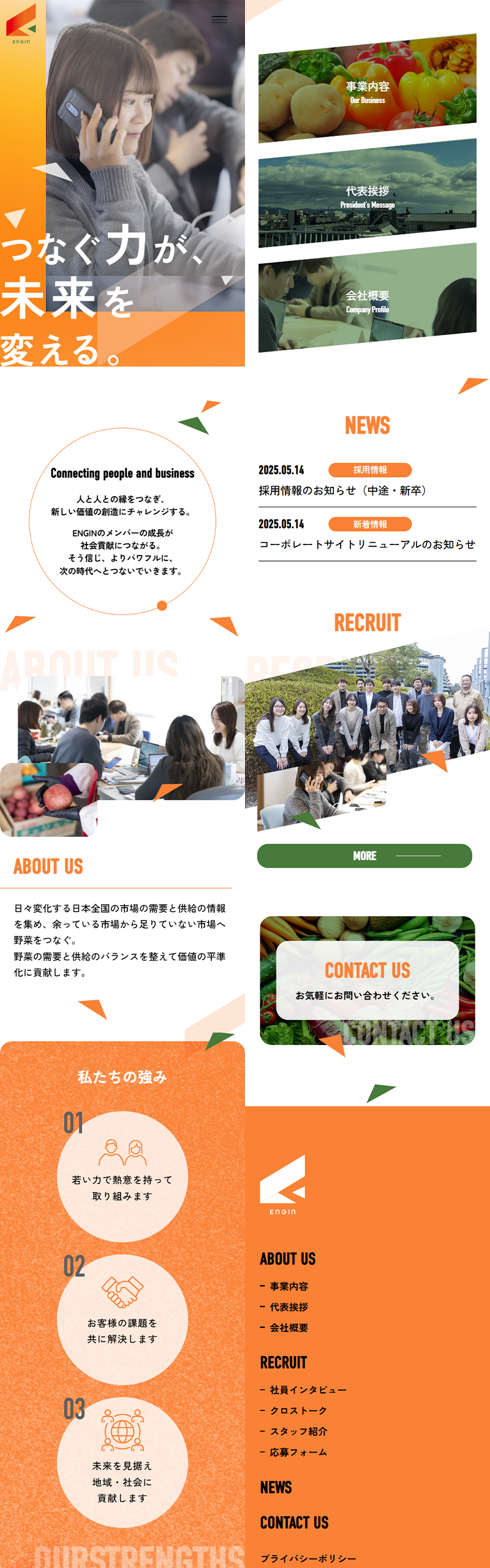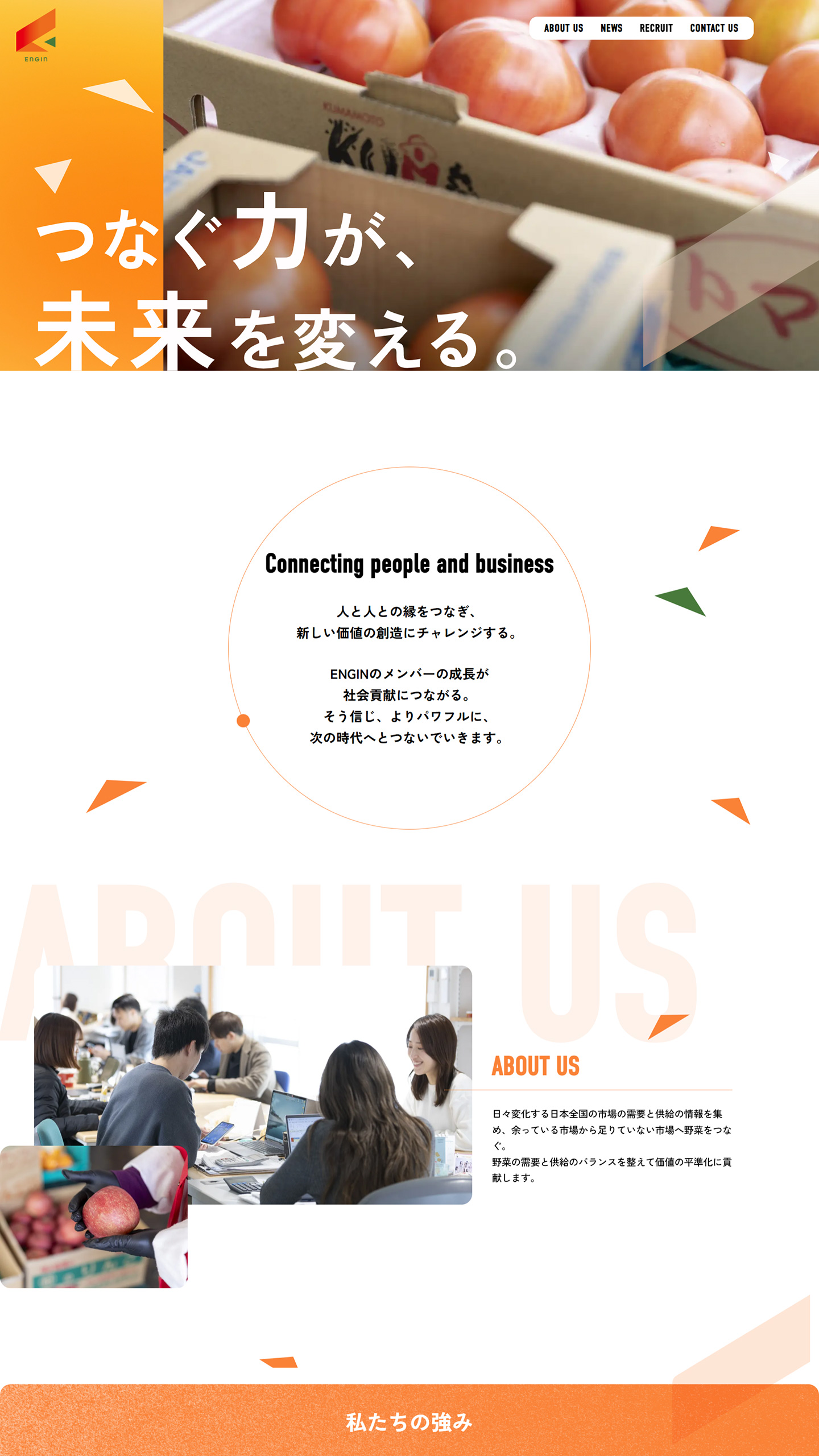 社員の本音を引き出し、採用ミスマッチを解消したWebサイトリニューアル 野菜の需給調整事業を手掛ける株式会社ENGIN様は、Webサイトのリニューアル時期を迎え、特にスマートフォンでの見やすさやデザイン性の向上を課題とされていました。また、採用強化に向けて、求職者に自社の魅力をより深く伝えられるサイトが必要な状況でした。そこで、レスポンシブ対応で明るくオープンなデザインへ全面リニューアルを実施。メンバークラスから役職者まで幅広い社員の方々へ一対一のインタビューを行い、入社後のリアルな働き方が伝わる記事を掲載しました。その結果、社員のモチベーションが向上し、経営層の意思決定にも良い影響が生まれました。採用面では、応募者が仕事内容をしっかり理解した上でエントリーしてくれるようになり、ミスマッチの大幅な減少に繋がっています。 URL https://engin-kyoto.co.jp/ カテゴリー コーポレートサイト リクルート 業種 BtoB 食材卸 プラットフォーム wordpress 所在地 京都府 Tweet Share Hatena Pocket RSS feedly Pin it 株式会社祥碩堂前の記事 サンワ化工株式会社次の記事